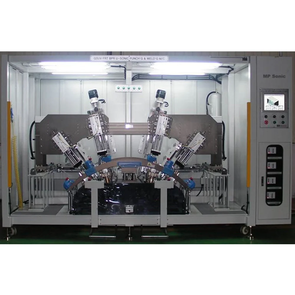 保险杠冲焊接设备应根据各项目要求进行特殊设计。根据保险杠的要求、材质和装配工艺,冲孔可采用机械加工或超声波加工,焊接一般采用超声波。超声波焊接一般采用气缸驱动,而冲孔的驱动通常采用伺服电机控制或增压气缸驱动。